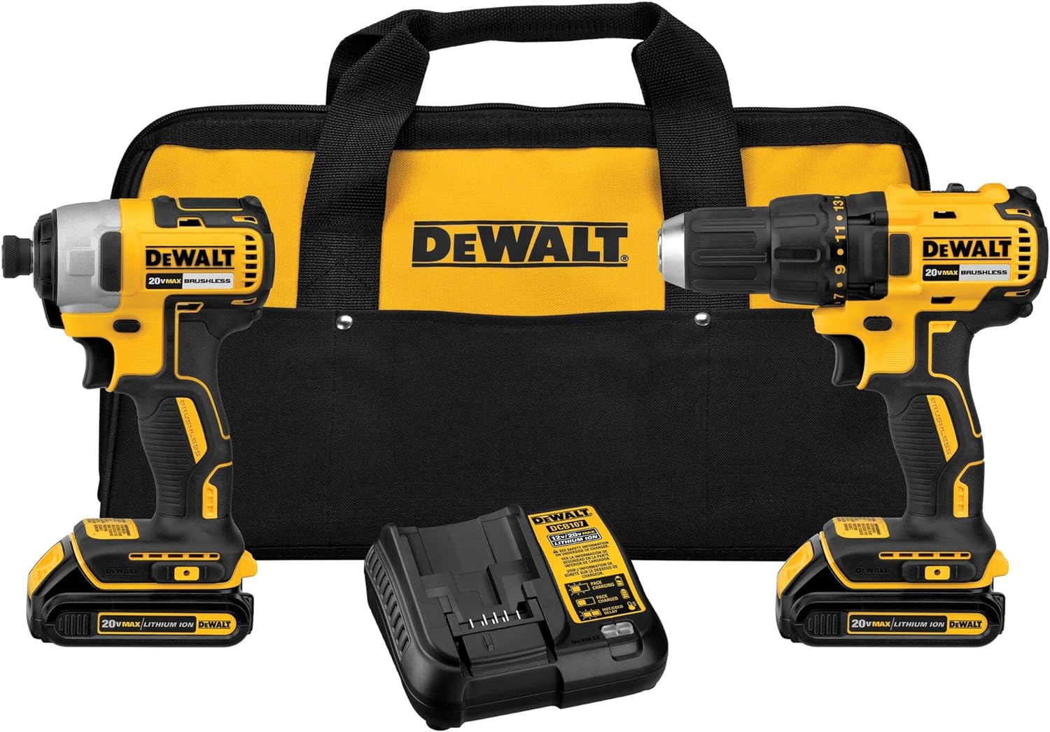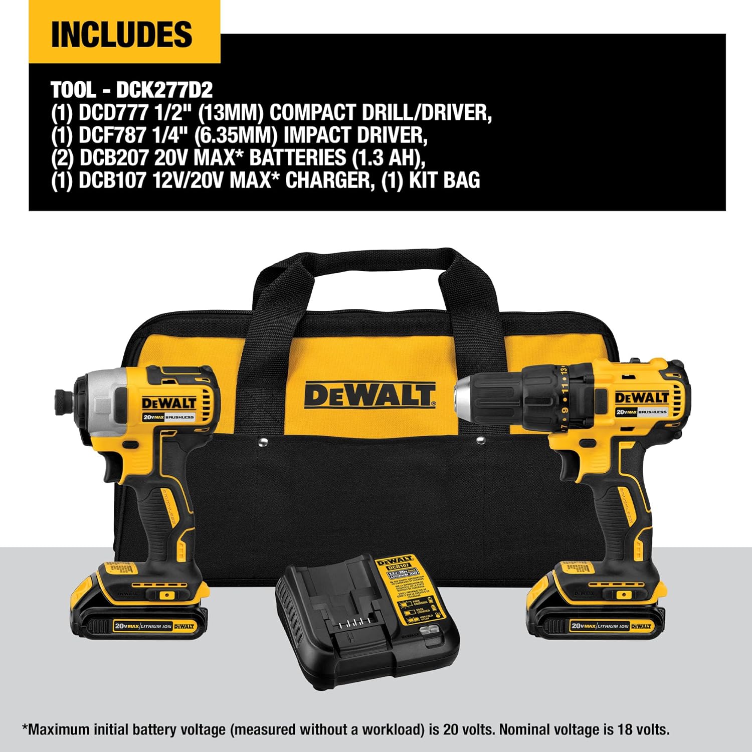 This DEWALT 20V MAX* brushless kit includes one 1/2 in. drill/driver, 1/4 in. impact driver, two 2.0 compact batteries, charger, and a contractor bag. The DCD777 1/2 in. drill driver is designed with a high-perofrmance motor that delivers 340 unit watts out. The DCF787 1/4 in. impact driver has a compact and lightweight design while providing 1,500 in-lbs. of torque.