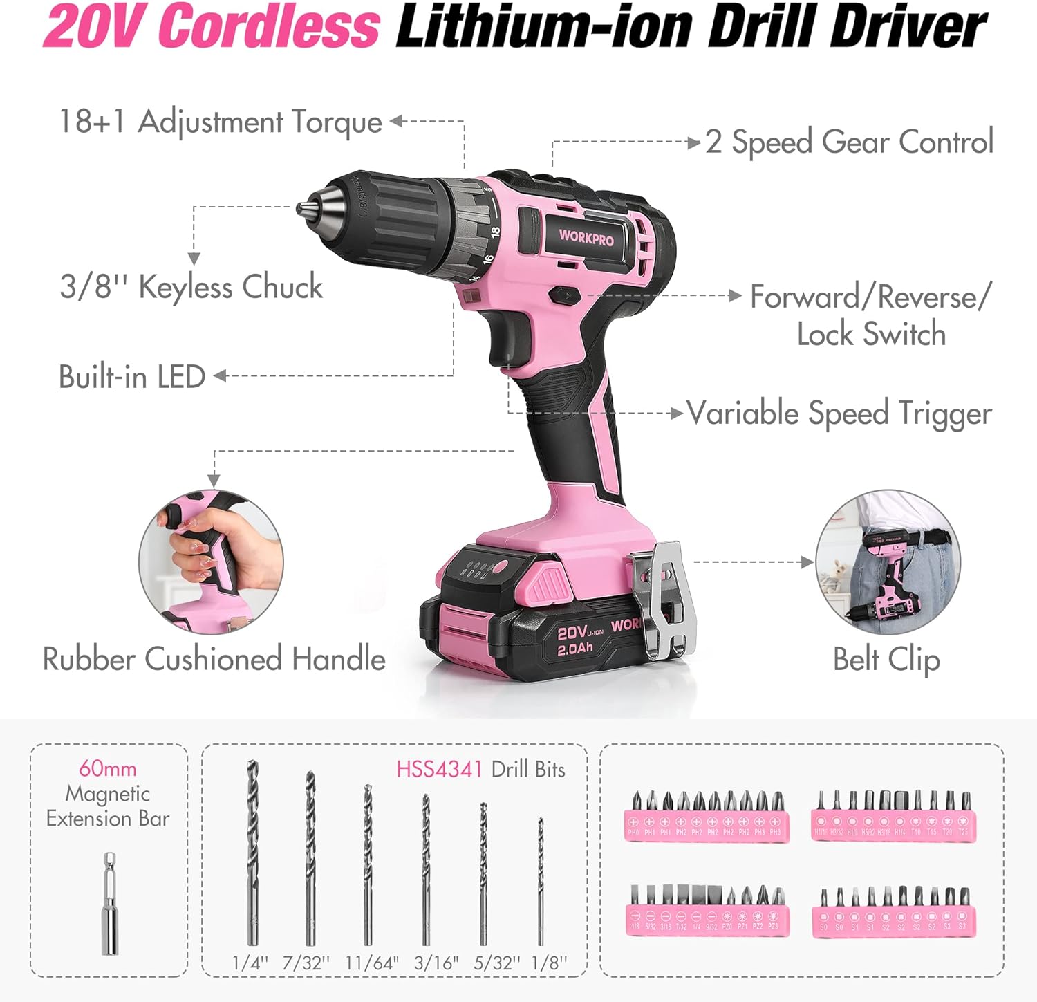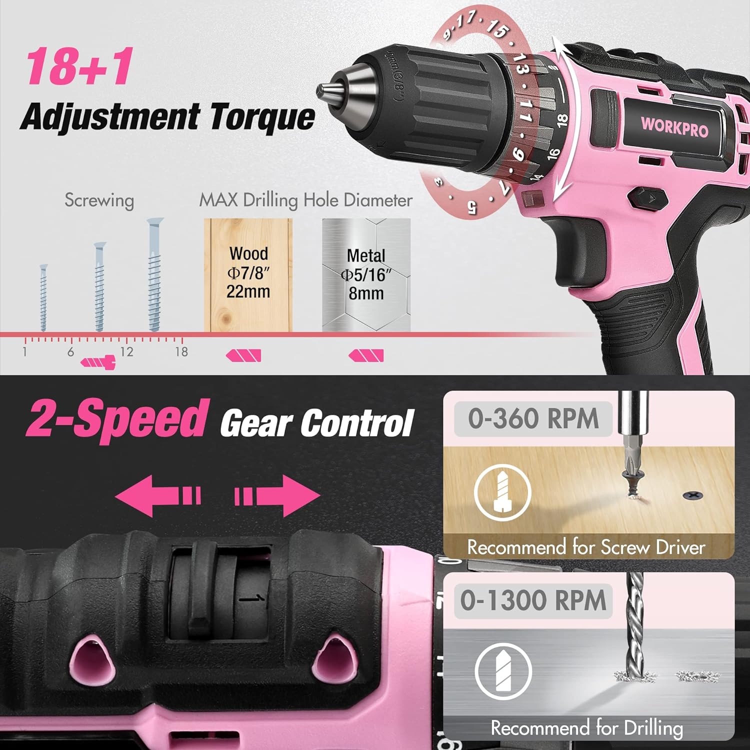 PINK DRILL DRIVER, tool set with drill equipped with 2-speed, 19 torque settings gives enough variability for wide applications. Ideal drill kit for home maintenance and garage repairs