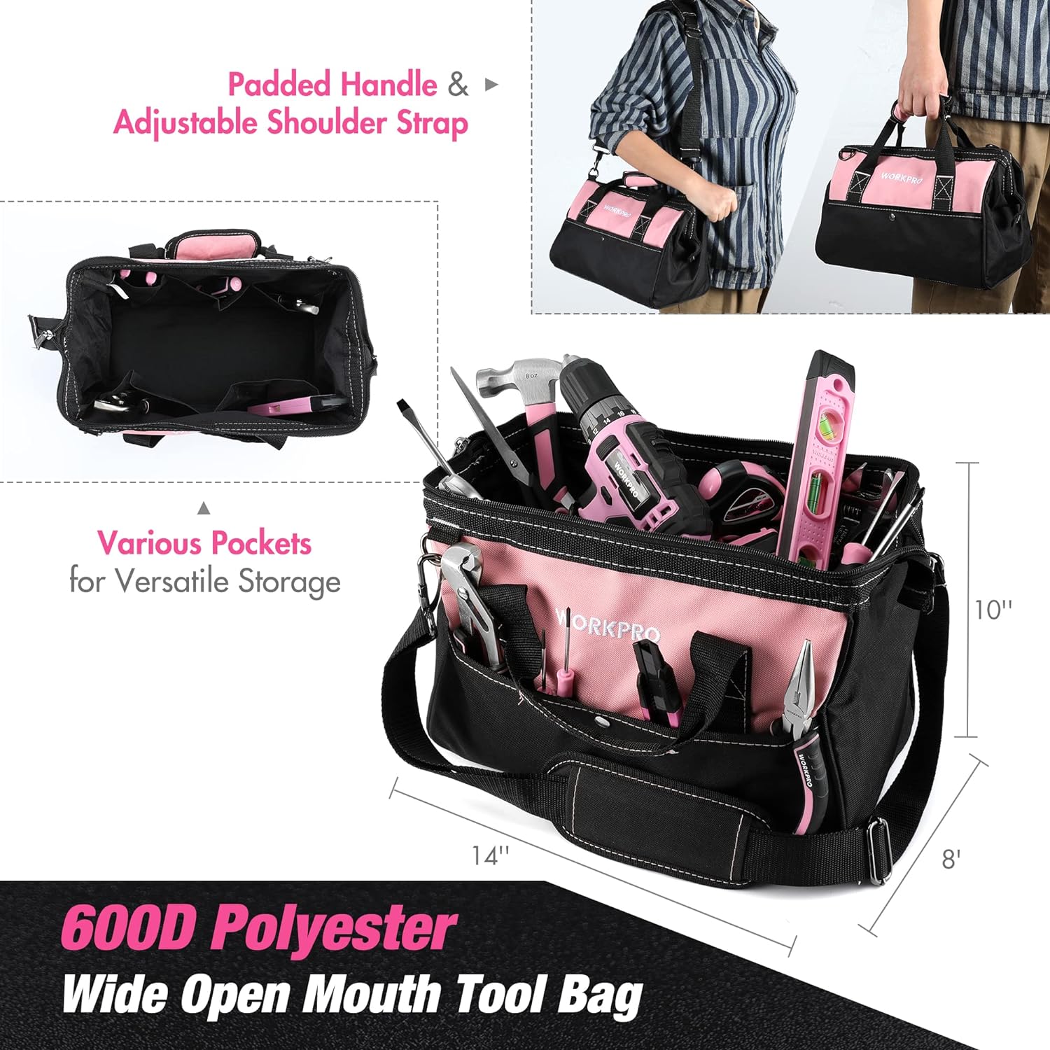 WORKPRO Pink Household Tool Kit with Drill, 157PCS Tool Set with 20V Cordless Lithium-ion Drill Driver, Home Tool Kit for All Purpose, Power Drill Sets with Pink Tool Bag – Pink RibbonCreate a new description for this product from the title with 500 characters